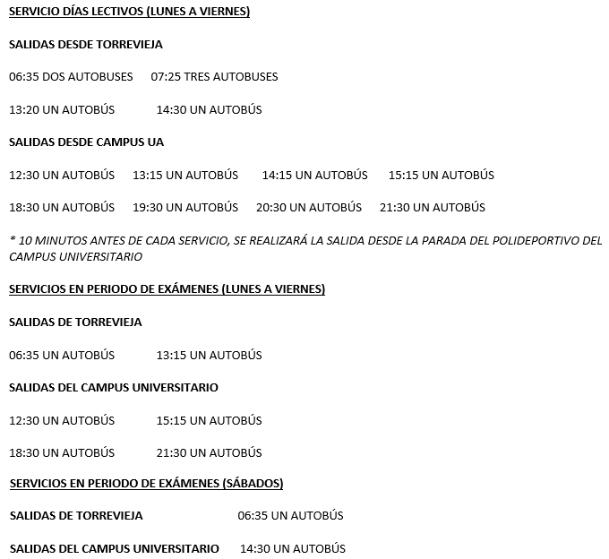 6. Hola, repecto al bus de las 9:30, sería salir de Torrevieja a esa hora o es la hora de llegada a la UA?
