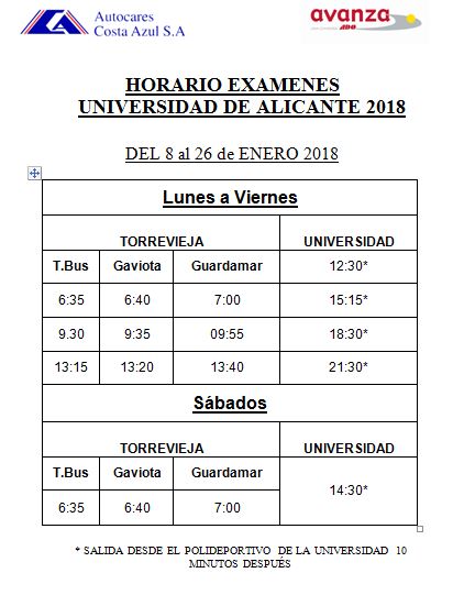 Hola a todos y a todas, esperamos que hayáis pasado unas buenas fiestas y que hayáis descansado! Ahora, toca estudiar y darle fuerte para los exámenes de enero. Como podéis ver en la imagen que os adjuntamos, el servicio empieza el día 8 de enero, y finaliza el 26, de acuerdo con el calendario de exámenes de la UA y además este año contamos con el autobús de las 09:30h, que para aquellos que tengáis examen a las 11, o cerca del medio día, supondrá… ¡más horas de sueño! También, os recordamos que se comenzará con el servicio normal de clases a partir del lunes 29 de enero.